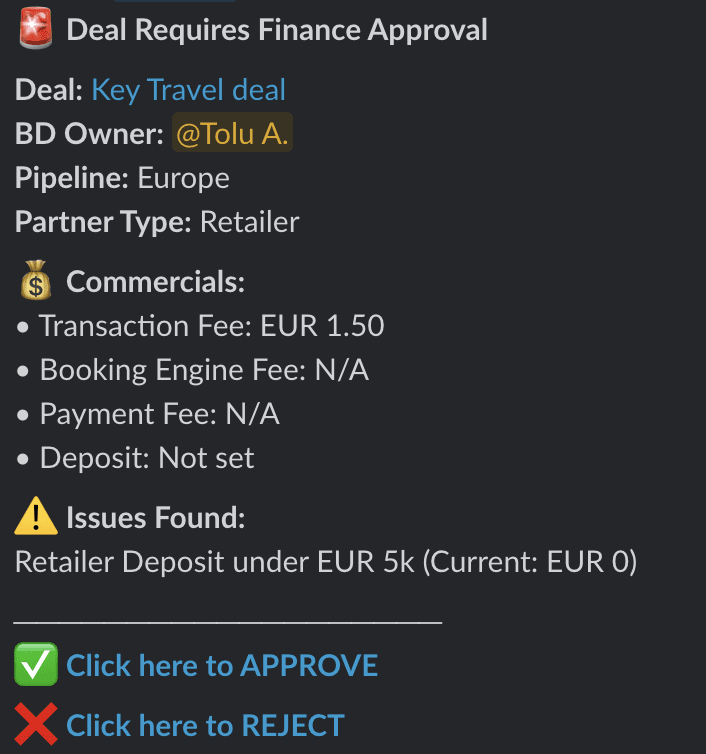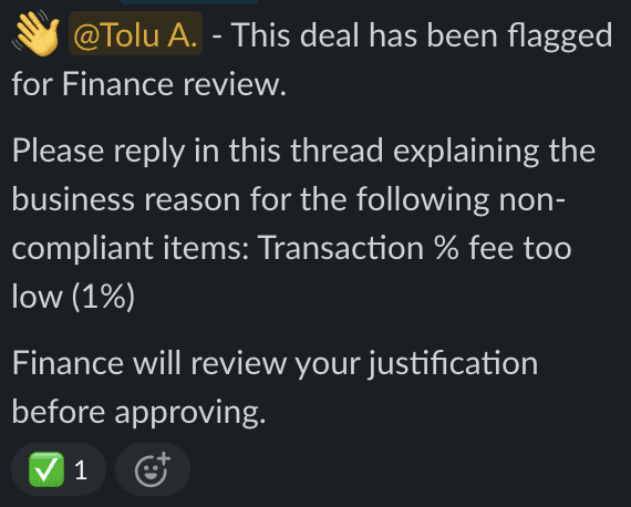 Slack-Based Approval: If a deal is flagged, Finance receives a rich Slack notification with one-click "Approve" or "Reject" buttons.